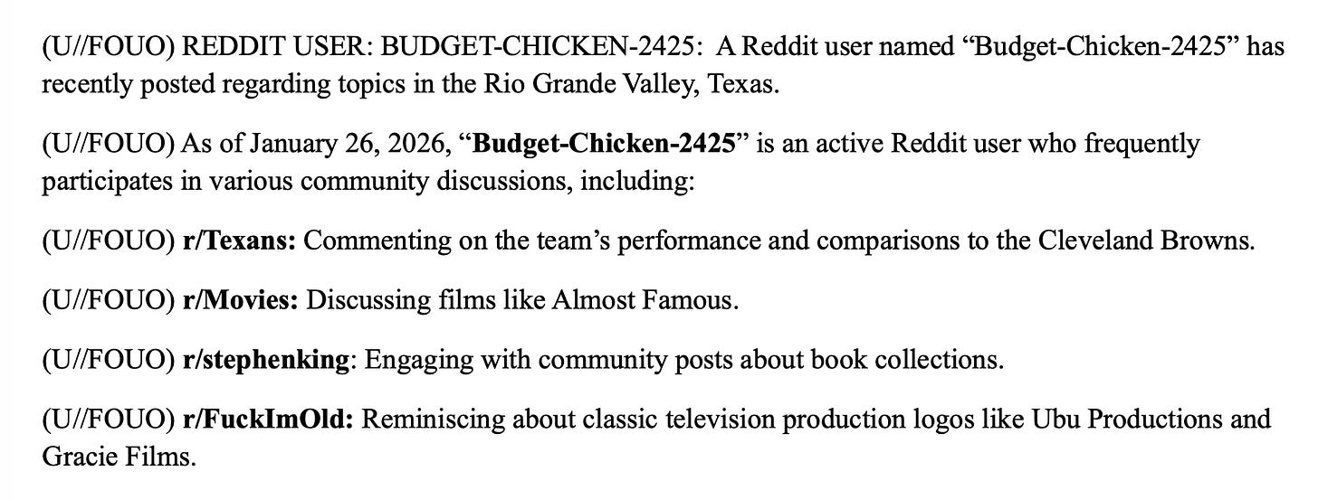 The spying is revealed in a January intelligence bulletin produced by the Border Patrol and leaked to me. The subject of the report is Reddit user "Budget-Chicken-2425," who is not a narco-trafficker, gang member, or terrorist. Just someone concerned about federal overreach.