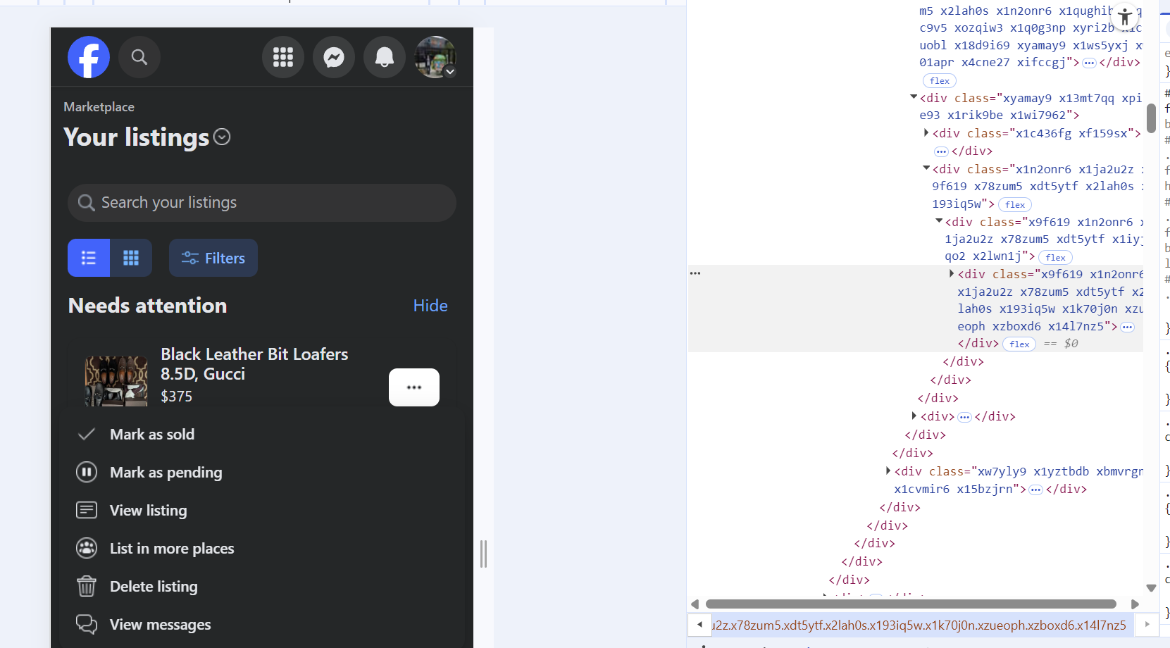 This is what the inspect window should look like on the right, with the mobile view of the suspended Facebook Marketplace ad appearing on the left, along with the three dot menu button which provides access to manage the ad, including deleting the listing.