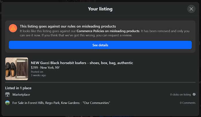 Genuine Gucci shoes Facebook Marketplace ad flagged as counterfeit